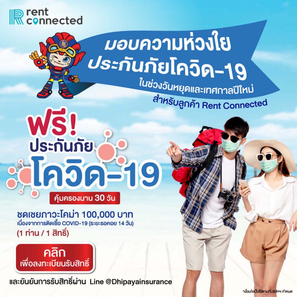 ไม่ว่าคุณจะเช่ารถกับ rent conneced หรือไม่ คุณสามารถกดรับสิทธิ์ฟรี! ประกันภัย Covid-19 เราขอมอบความห่วงใย จากเราได้
