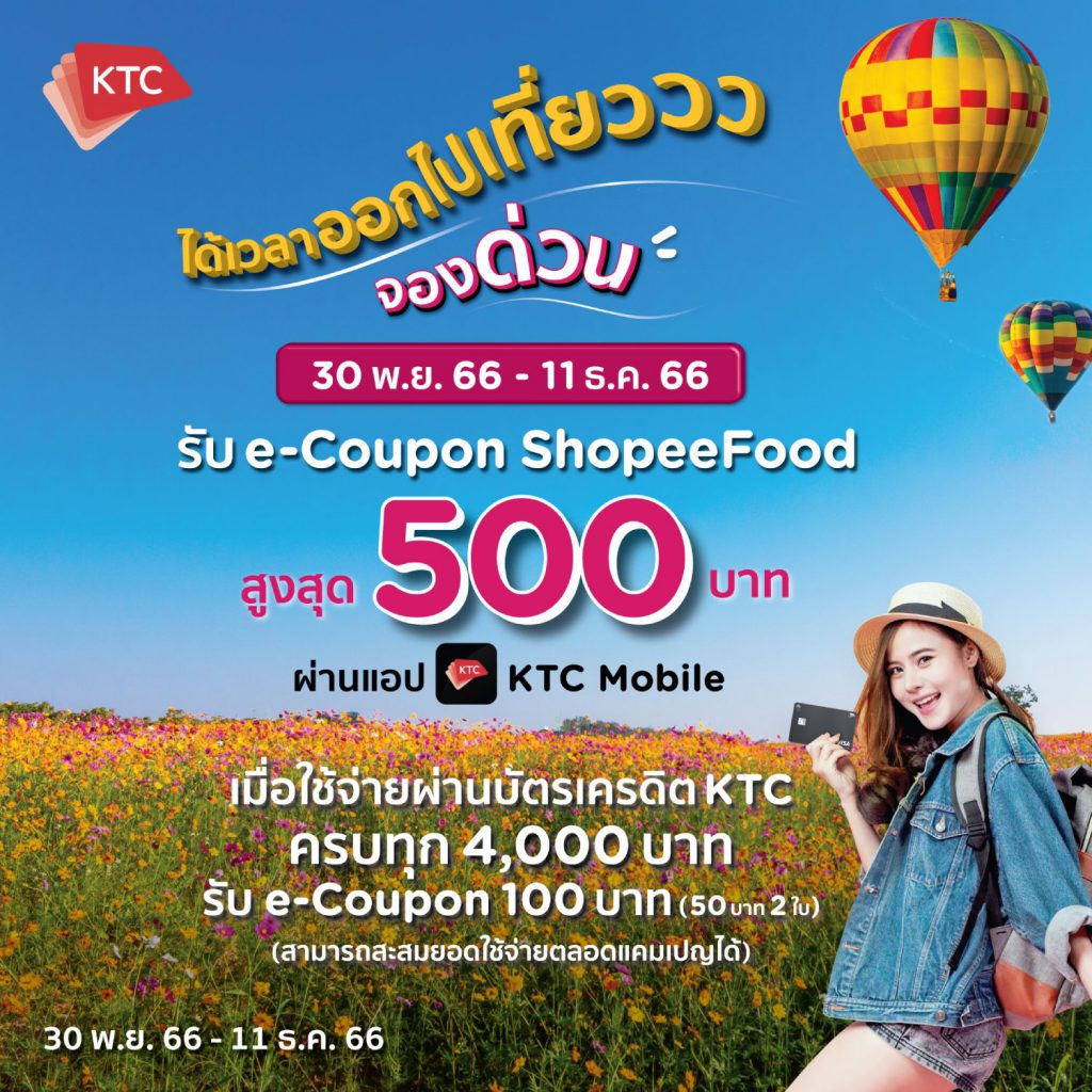 เพียงใช้จ่ายผ่านบัตรเครดิต KTC และชำระเต็มจำนวนกับพันธมิตรที่ร่วมรายการ ทุก 4,000 บาท รับ e-Coupon ส่วนลด ShopeeFood มูลค่า 50 บาท จำนวน 2 ใบ (รวม 100 บาท)